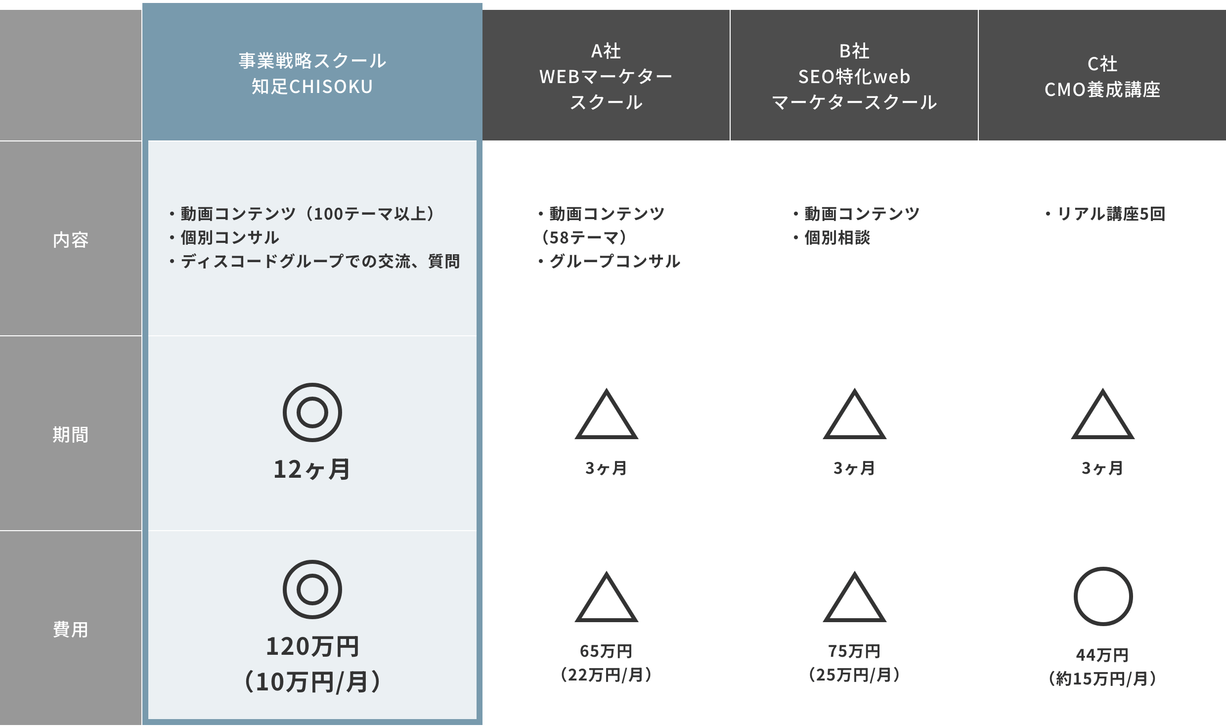 事業戦略スクール 知足は、他社より長い学習期間と手厚いサポートで、
